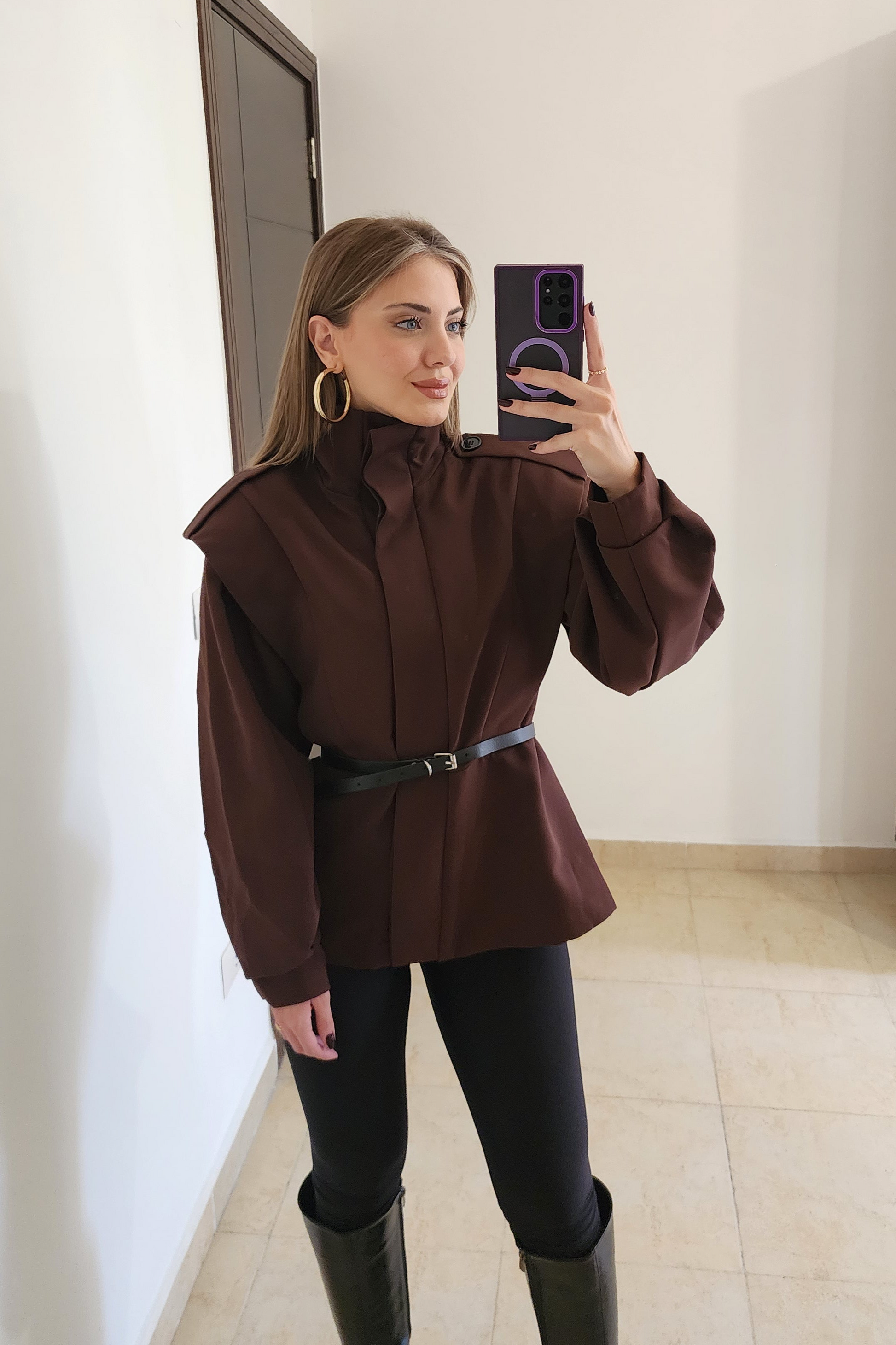 An elegant brown jacket designed with a matching belt for a flattering silhouette. Its versatile cut makes it perfect for both day and evening wear. Comes in sizes S, M, L. Model is 53kg, 160cm and is wearing size Small.