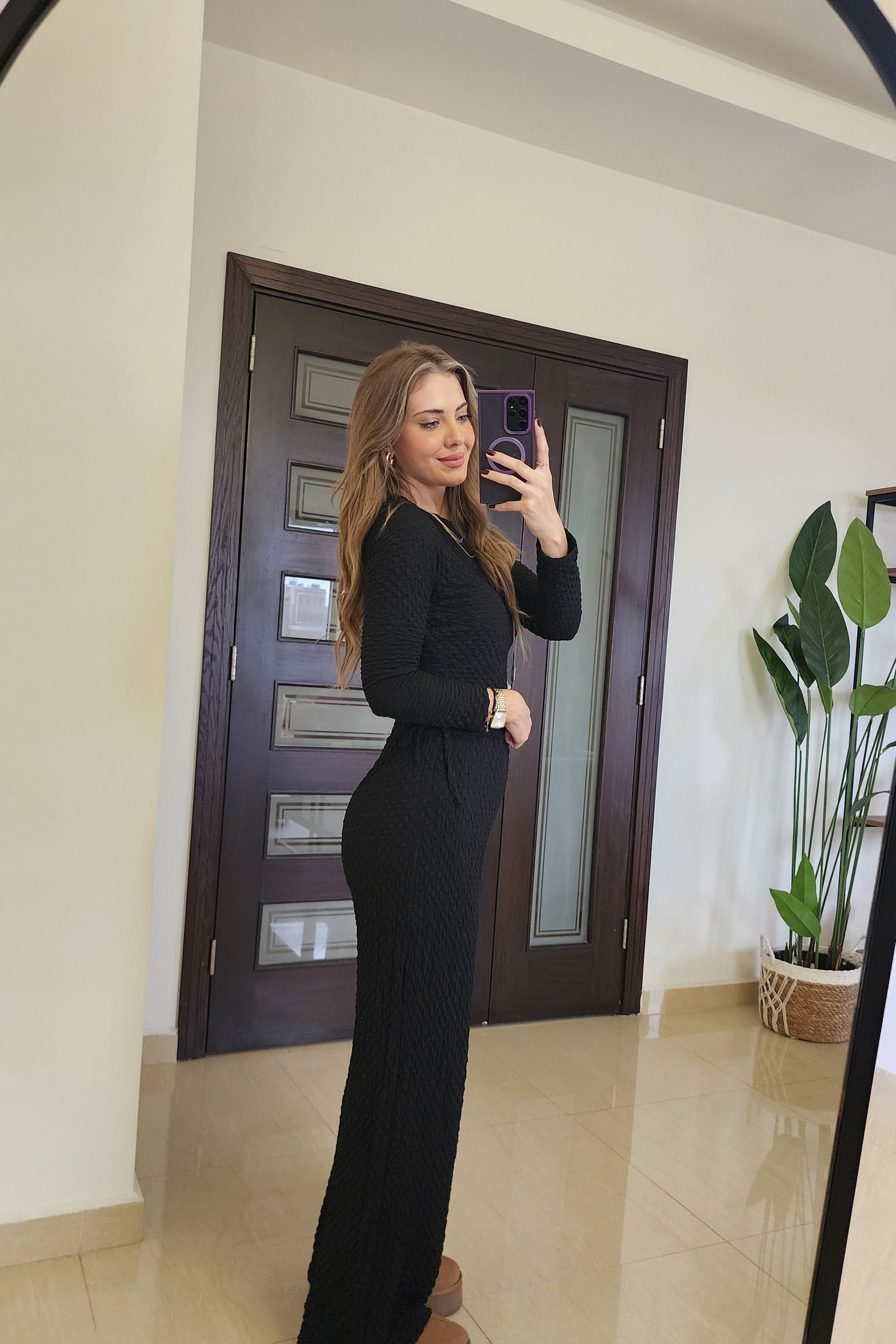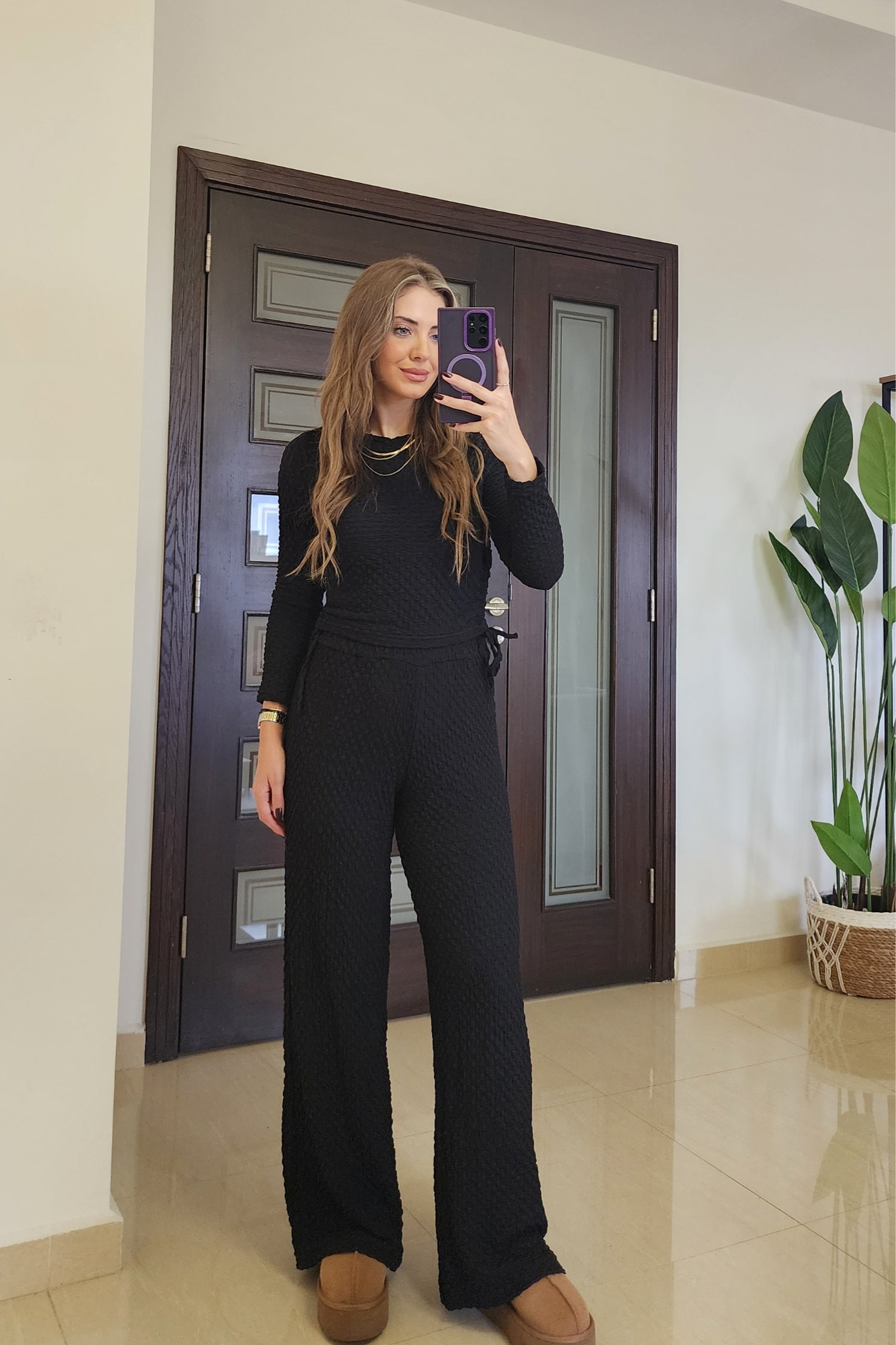 A cozy yet elevated two-piece featuring a textured long-sleeve top with side tie details and matching wide-leg pants. Designed in a soft taupe tone, this set blends comfort with effortless style — perfect for casual days out or relaxed evenings in. Model is 53kg, 160cm wearing size S.