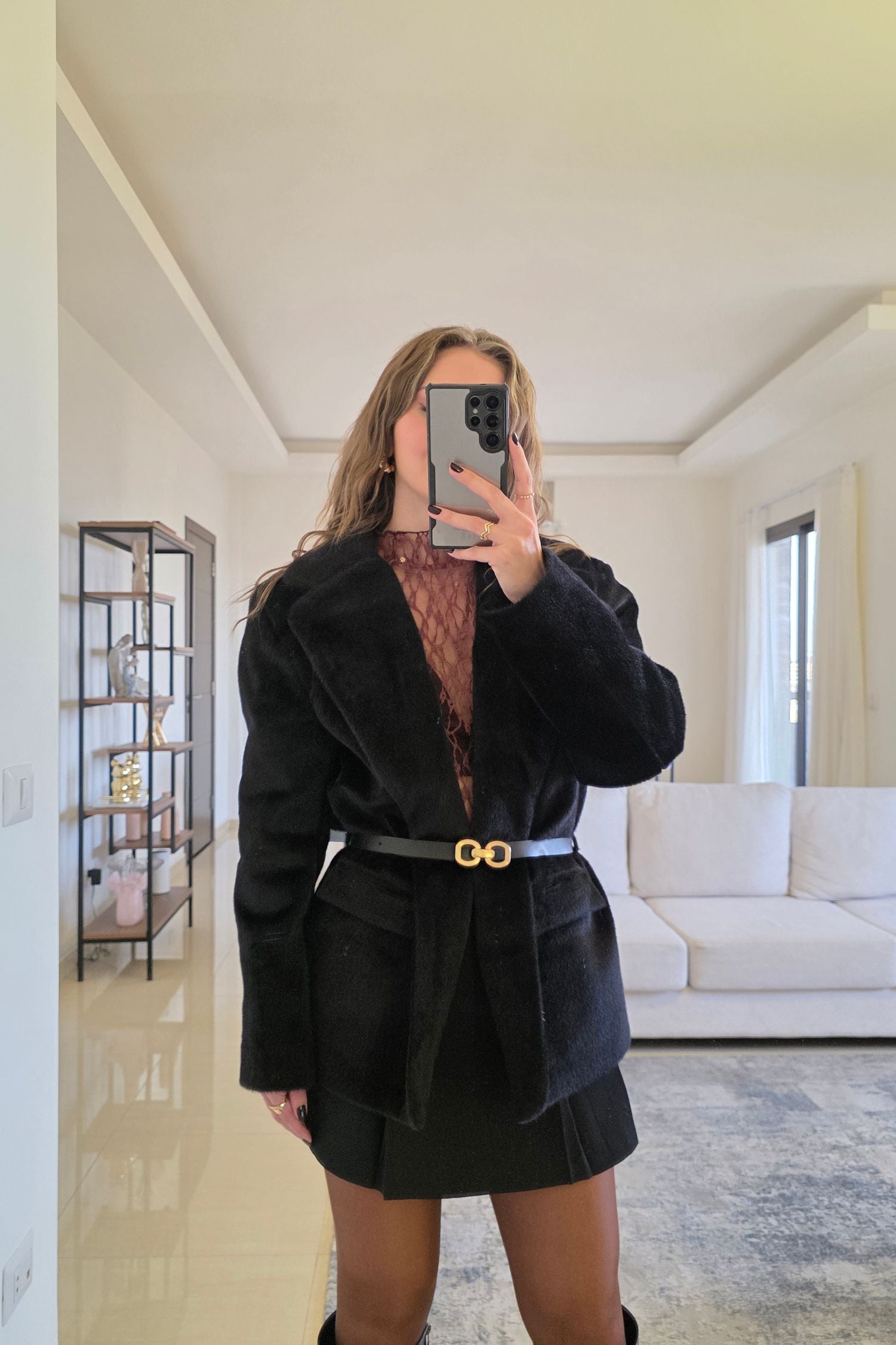 A luxurious black jacket crafted from high-quality fabric, featuring a soft structured shape and a sleek detachable belt that cinches the waist beautifully. Designed for warmth and effortless elegance, it pairs perfectly with both dresses and everyday looks. True to size. The model is 160 cm and 53 kg wearing size S.