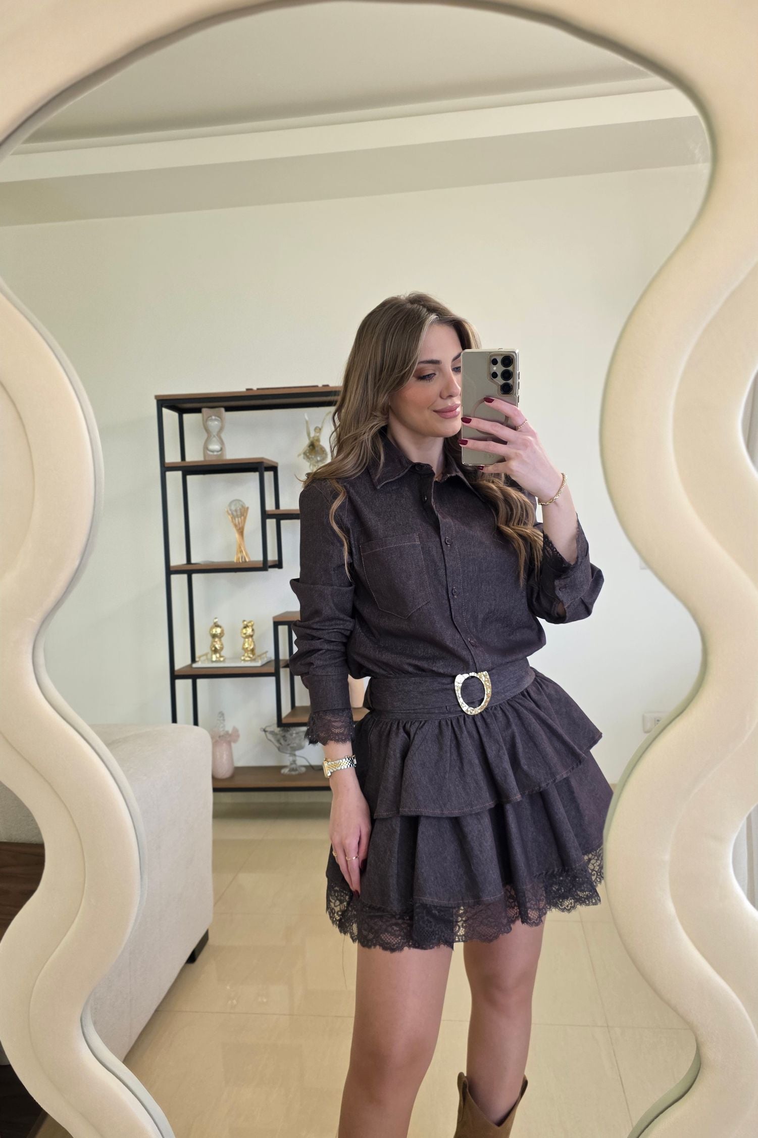 Stylish denim mini dress featuring a flattering fitted silhouette and a matching belt that accentuates the waist. A timeless piece that blends casual denim with a chic, feminine look. Available in S, M, L. Model is 160 cm tall, weighs 52 kg, and is wearing size Small.