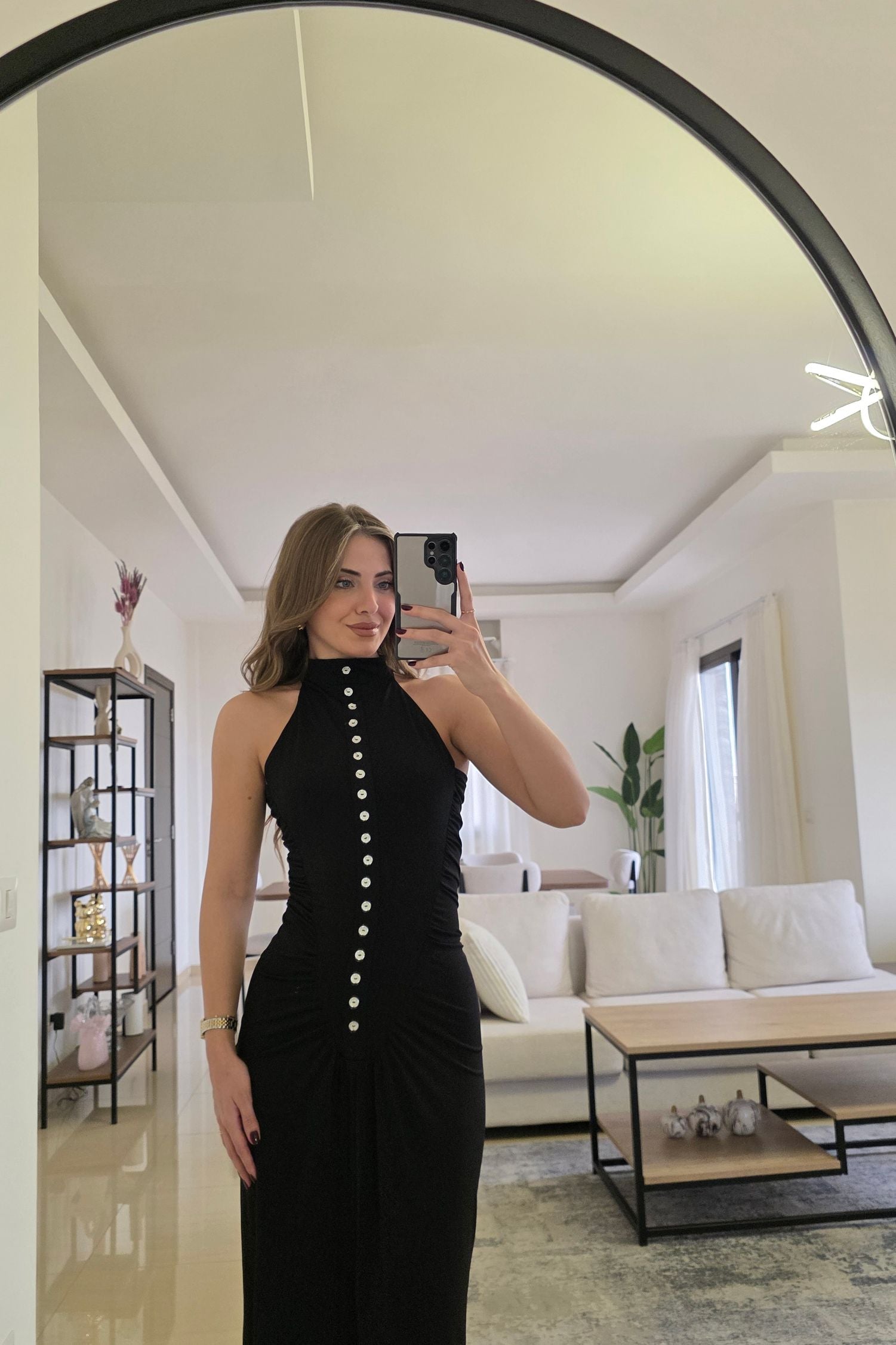 Long black dress featuring front button details and a smooth, flattering silhouette. High-quality fabric, true to size, and perfect for elevated everyday styling. Available in S, M, and L — model is wearing size Small, 160 cm, 53 kg.