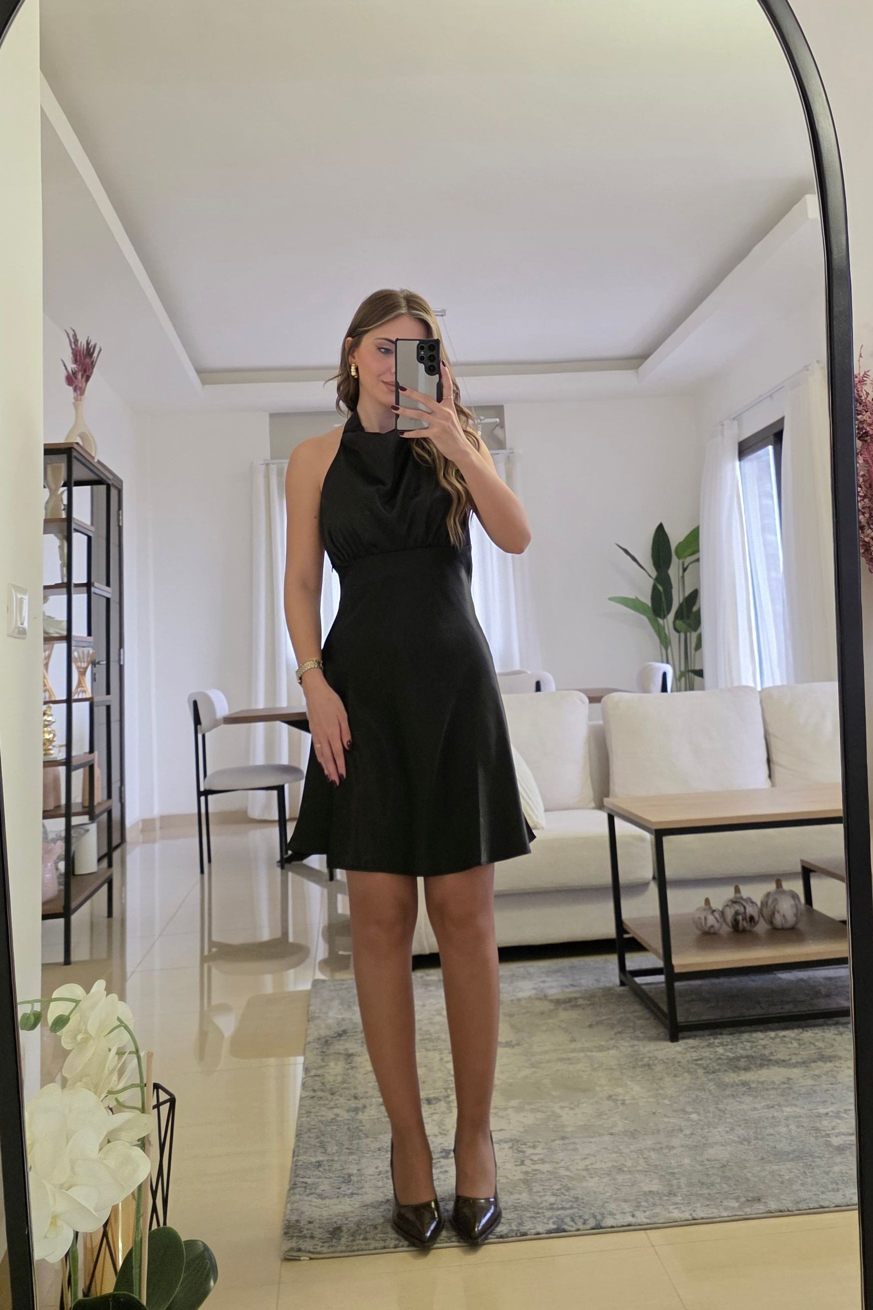 Elegant black satin short dress with a smooth, glossy finish and a flattering silhouette. High-quality fabric, true to size, and perfect for elevated evening looks. Available in S, M, and L — model is wearing size Small, 160 cm, 53 kg.
