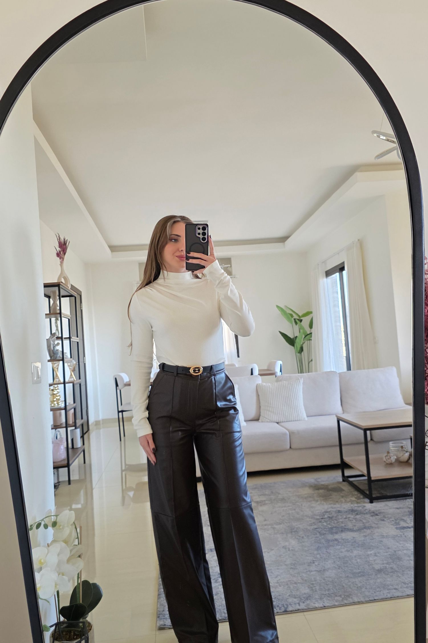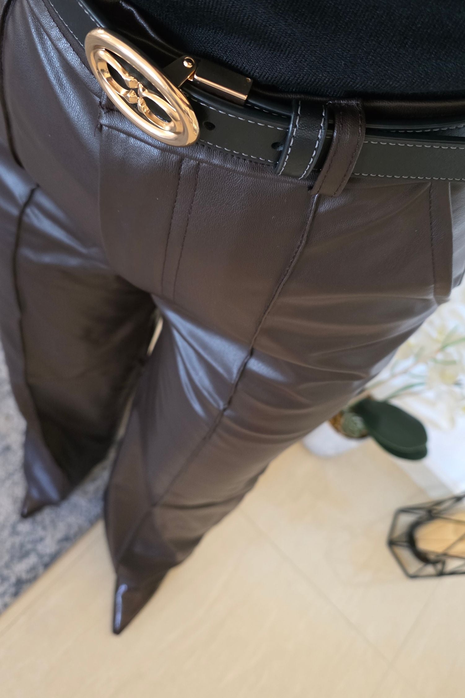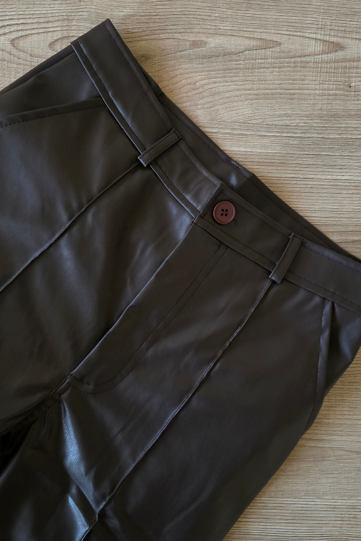 High-quality brown leather pants designed with a sleek, flattering silhouette and a smooth finish. Structured yet comfortable, perfect for elevated day-to-night styling. True to size. Available in S, M, and L — model is wearing size Small, 160 cm, 53 kg.